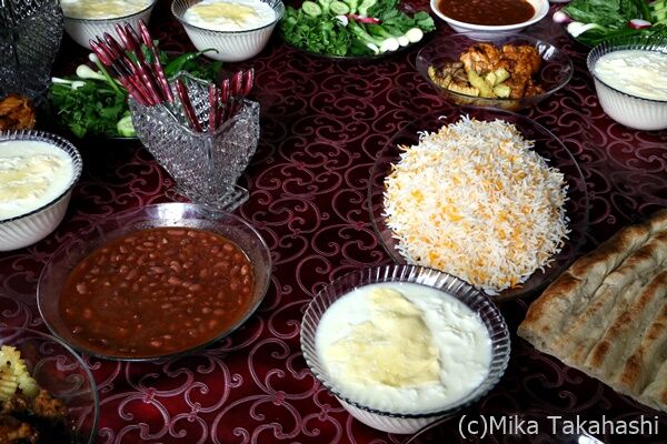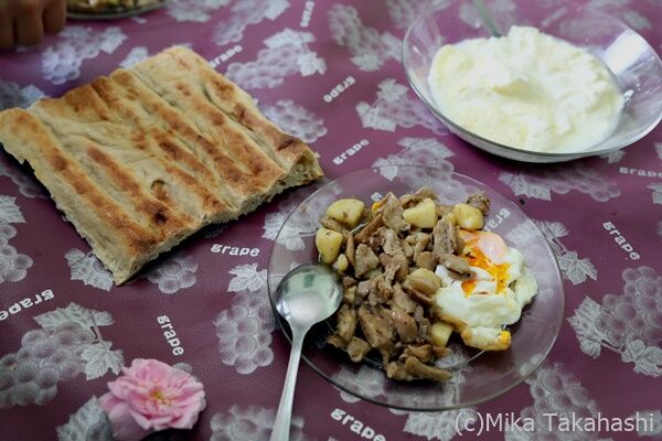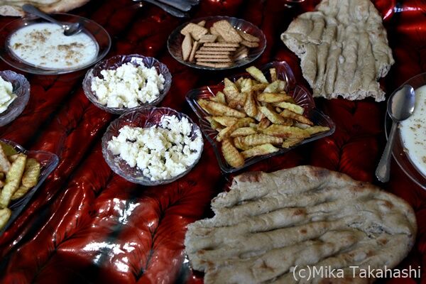 山の上の朝ごはん。搾りたてのミルクで作った甘いプディングのようなものや自家製のバターやナン、フライドポテトが並ぶ。このギザギザカットが近年の山での流行。