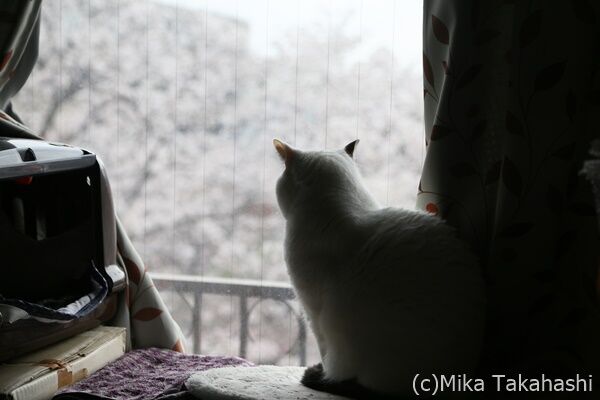 桜を窓から眺めるシロ。この冬も無事に(とひとことで書くには、何度か体調悪化のちいさな危機はあったものの)大病することなく乗り切れて、春を迎えることができた。シロはノラ猫のころ、またはノラ猫にされる前(つまり公園に棄てられる前)、どんな景色を眺めていたのだろう。舞い散る桜の花びらを振り払ったり、追いかけたりもしたのだろうか?